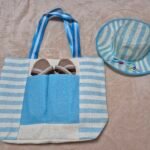 👜 Bolso playero confeccionado en tejido resistente con cierre superior y bolsillo interno para mantener tus objetos seguros. Diseño a rayas en tonos turquesa y natural, con asas firmes y cómodo espacio para toallas, protector y más.