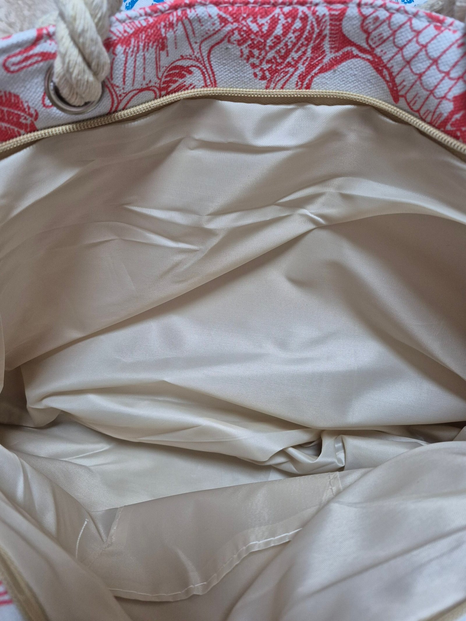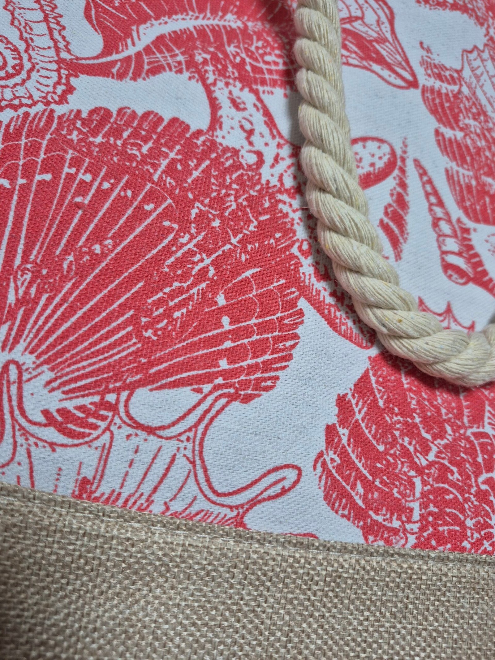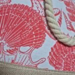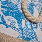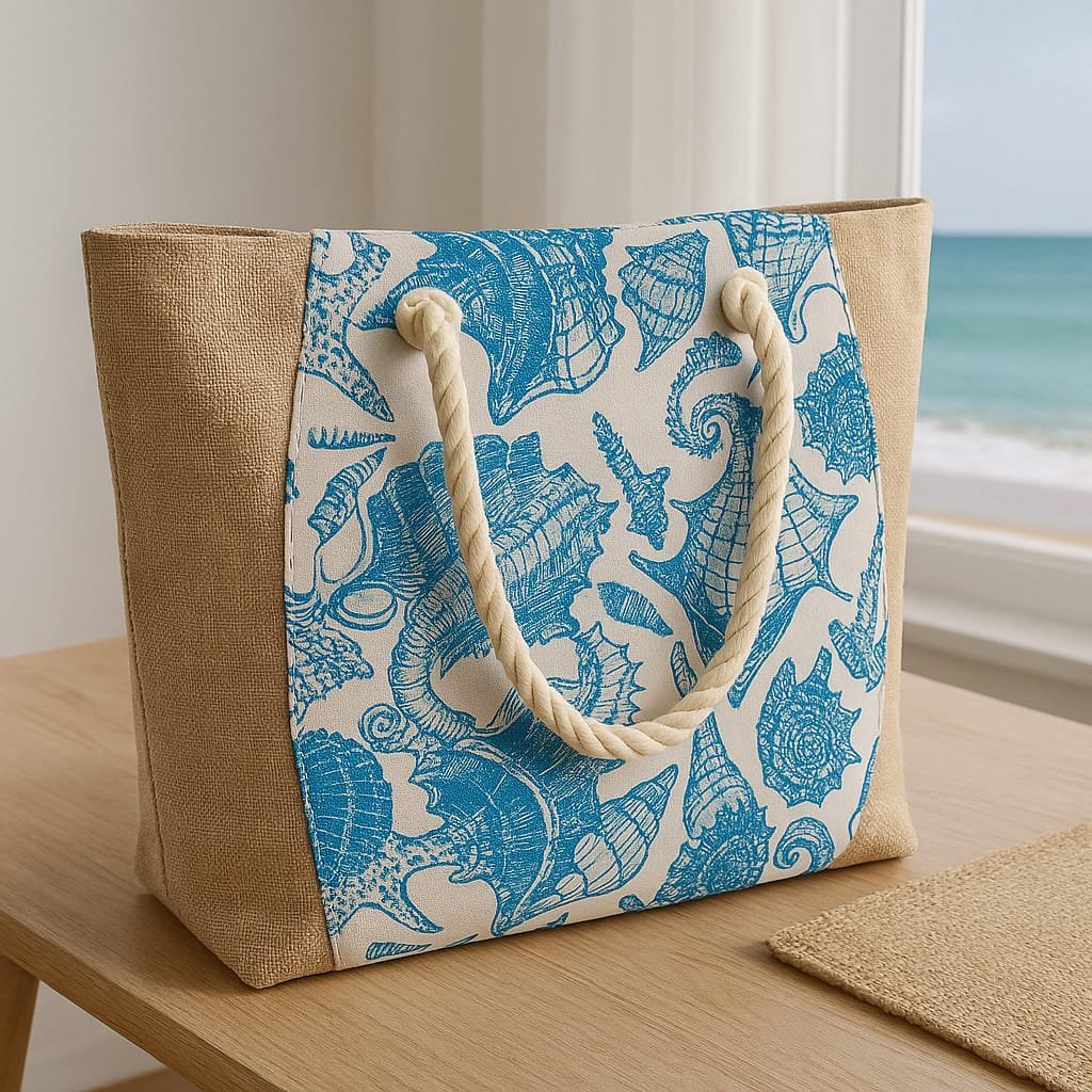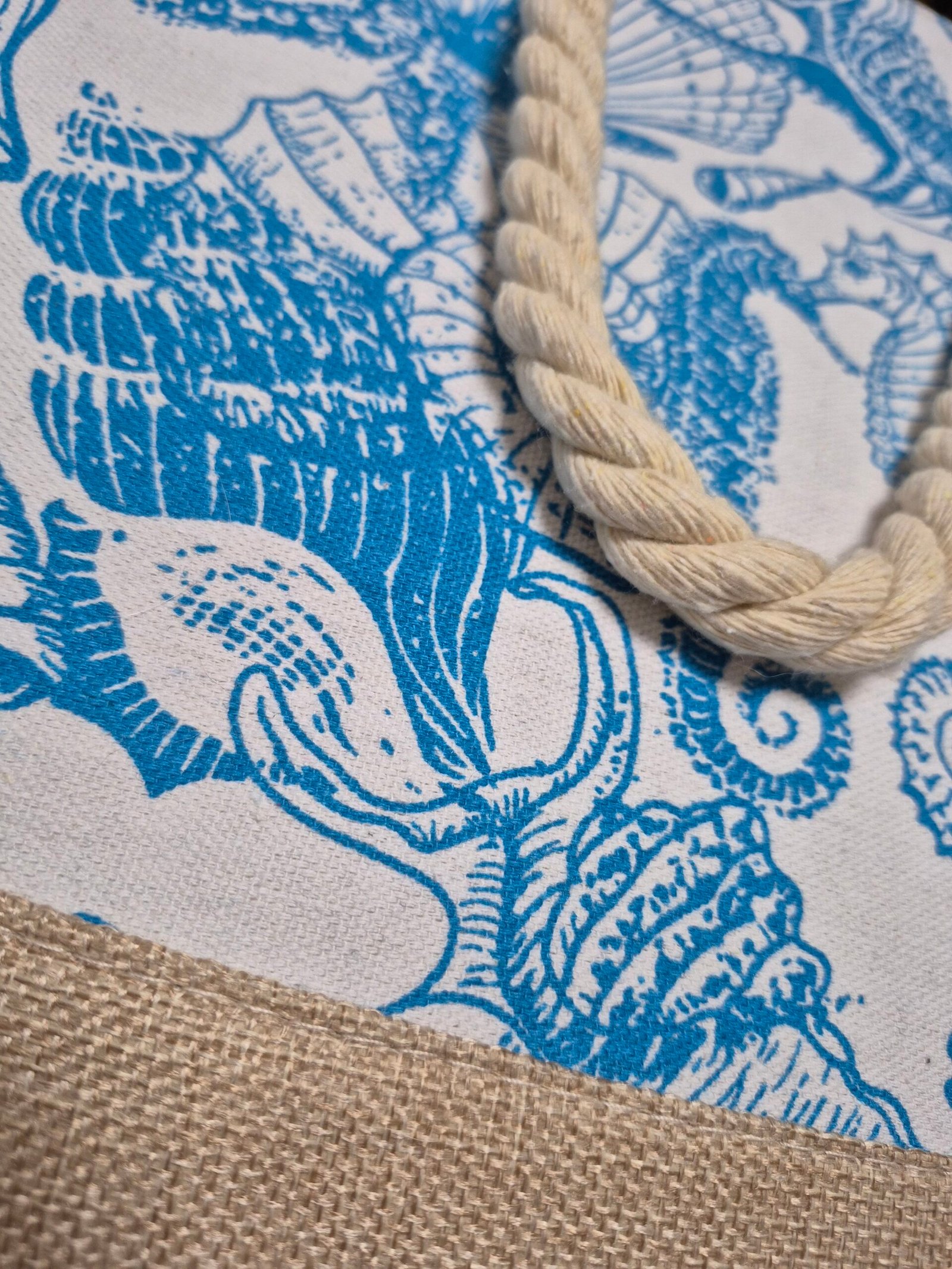 Bolso de lona beige con frente estampado en azul de caracolas marinas.