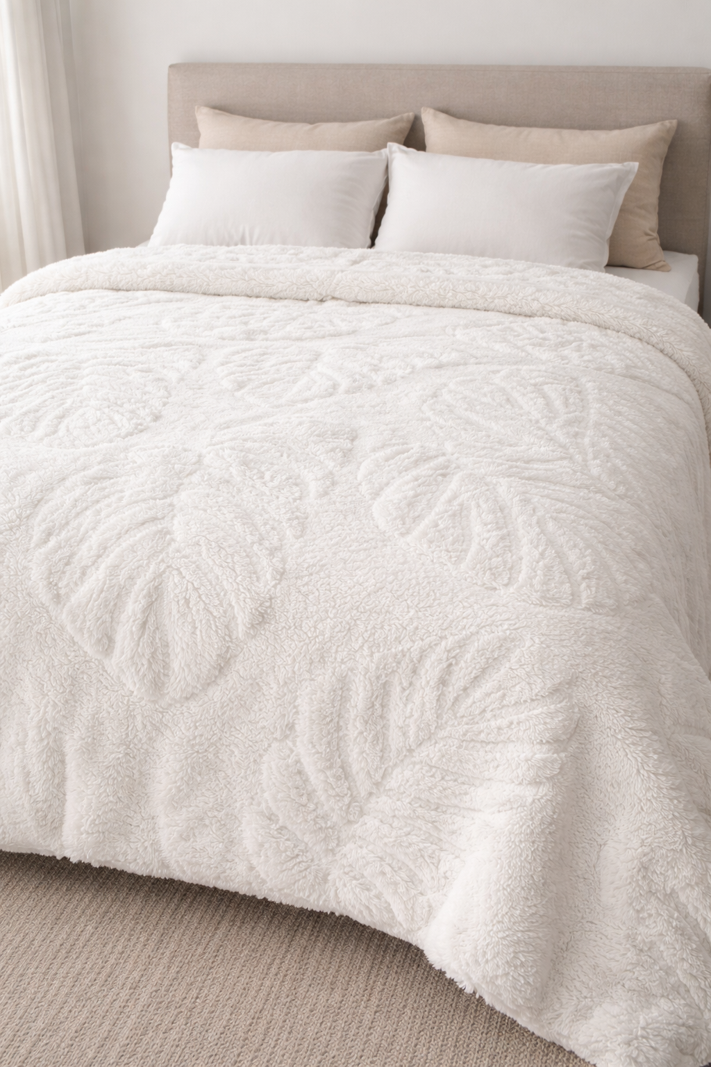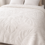 Manta plush con corderito extra suave con diseño en relieve de hojas tipo monstera, pensada para sumar abrigo y un toque elegante a tu cama.